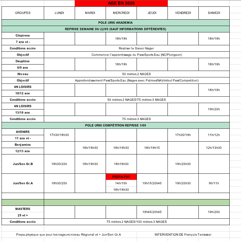 🐙 Chipirons (7 ans et moins) – Objectif SNS Selon les tests d’entrée au club. 2 entraînements par semaine (45’ et 1h) Acquisitions des compétences du Savoir Nager en Sécurité et début Pass’Sports Eau 🐬 Dauphins (8-9 ans) – Objectif Pass’Sport de l’eau Selon les acquisitions/évolutions de chacun. 2 entraînements par semaine (2*1h) Acquisitions des compétences du Pass’Sports Eau 🏊♂️ URKI 4 Nages – Groupe 1 (10-14 ans) Perfectionnement dans les 4 nages, tout en ayant une notion d’entraînement. 1 entrainement par semaine: Samedi 18h-/19h 🏊♂️ URKI 4 Nages – Groupe 2 (15 ans et +) Apprentissage des quatre styles de nage pour les jeunes de 15 ans et +, avec un focus sur l’amélioration des techniques de base. – 1 entrainement par semaine: Samedi 19h-/20h |